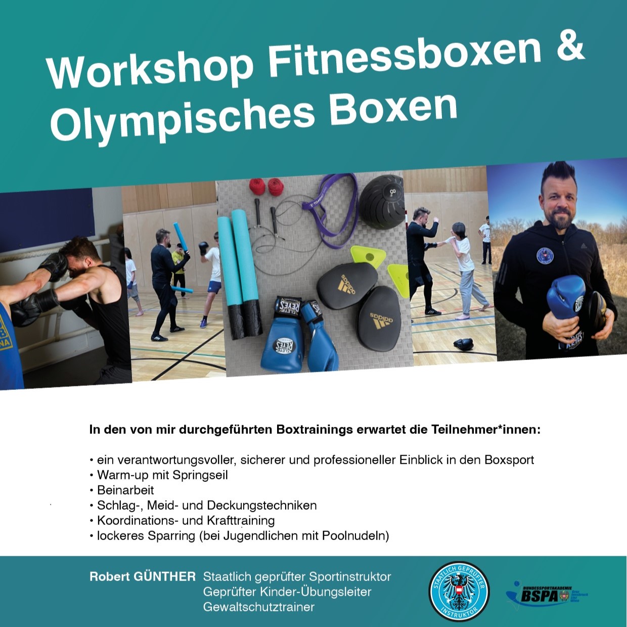 Ich bin staatlich geprüfter Sportinstruktor mit dem Schwerpunkt Fit - gesundheitsorientiertes und präventives Training, sowie ASKÖ-WAT zertifizierter Kinder-Fit-Übungsleiter. Als Boxer kann ich auf bald 15 Jahre Erfahrung zurückgreifen.